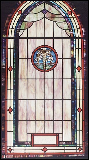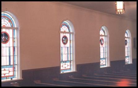 Medallion scene window style as shown from an interior. The lower section of each of these windows is designed to incorporate replaceable dedication plate.