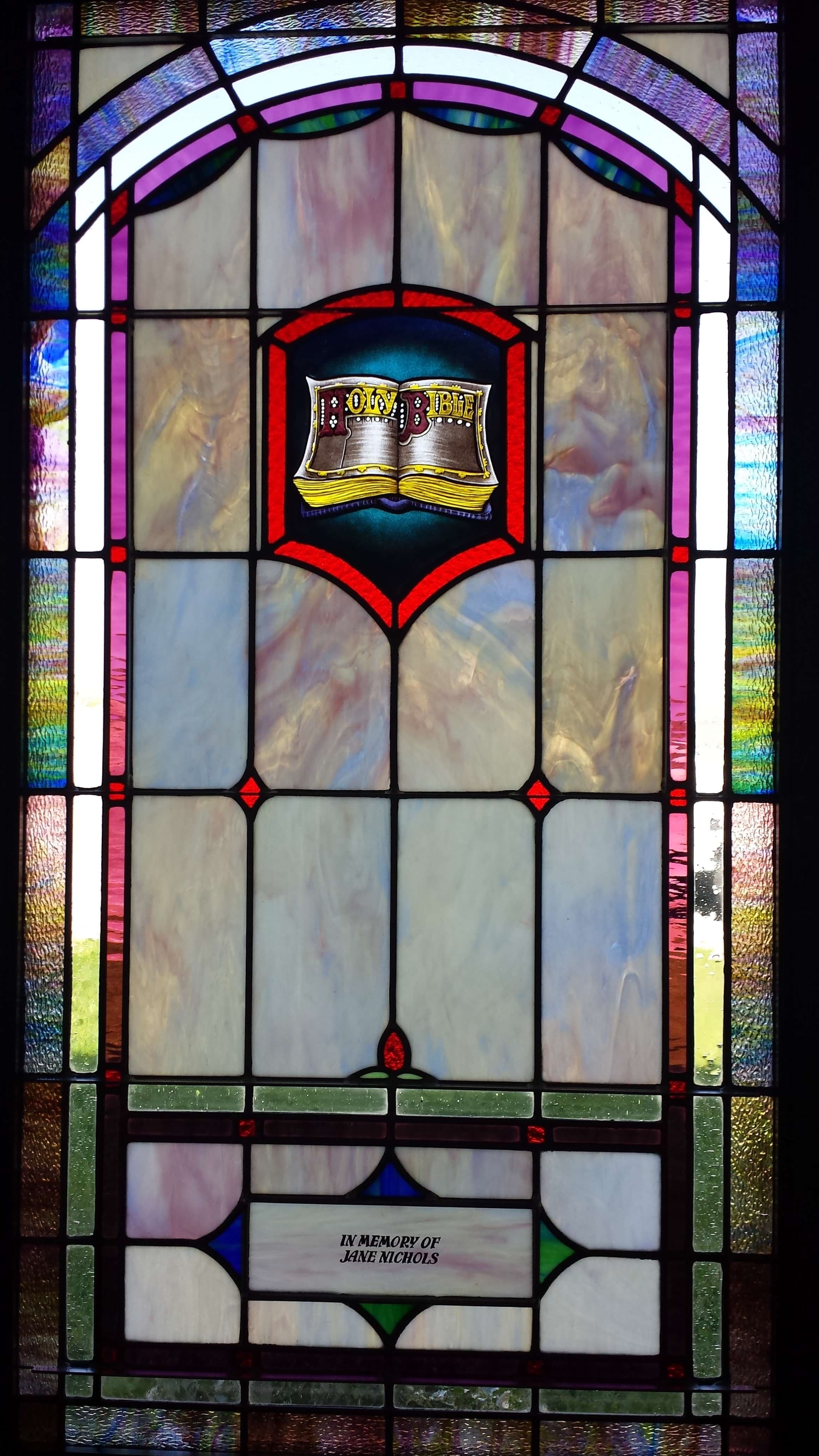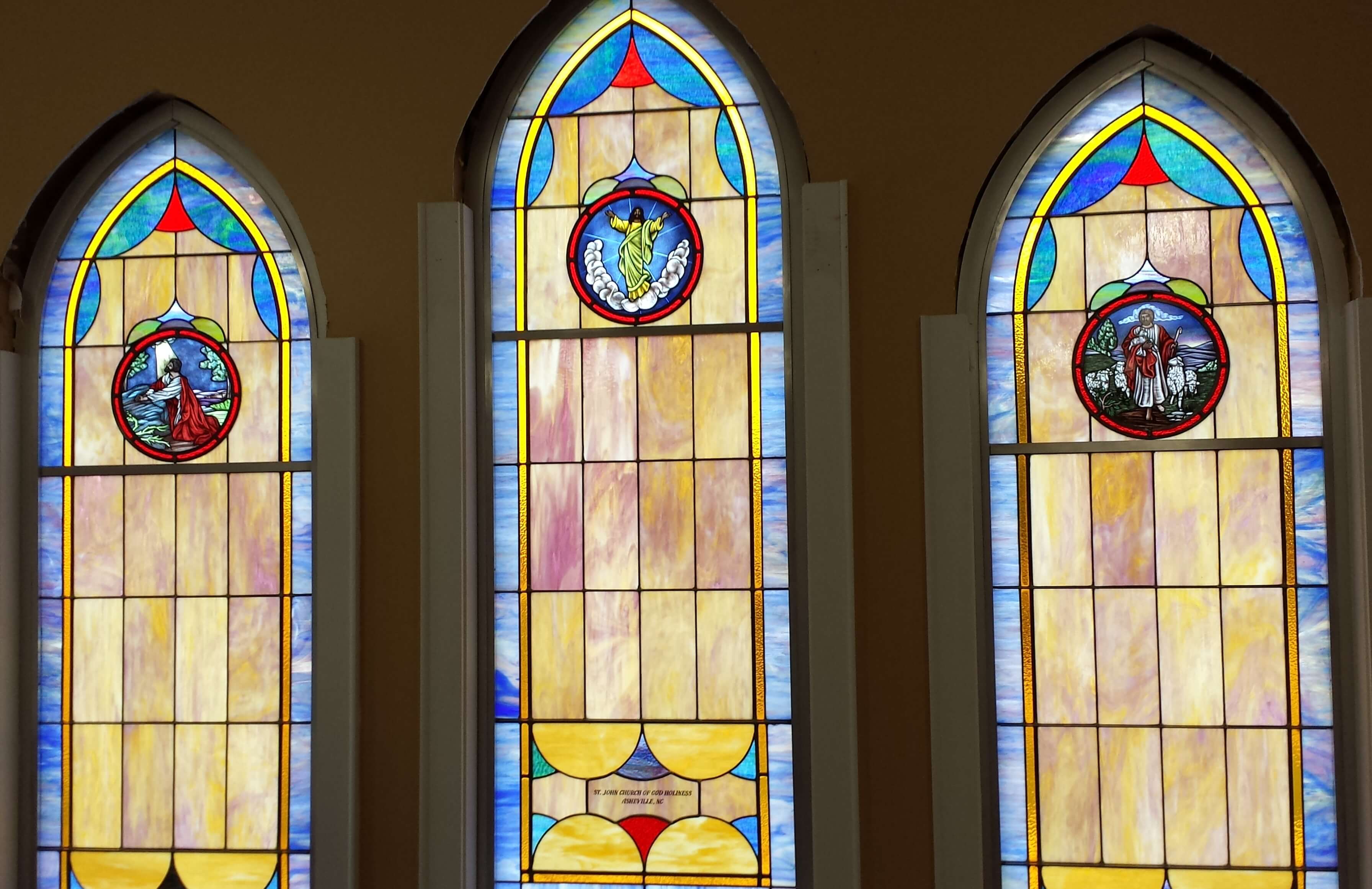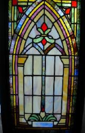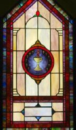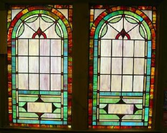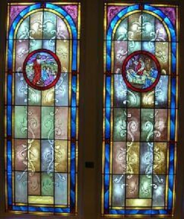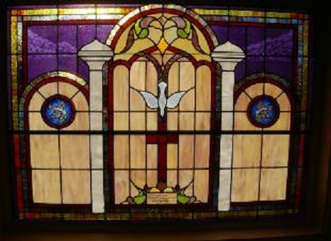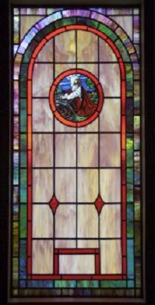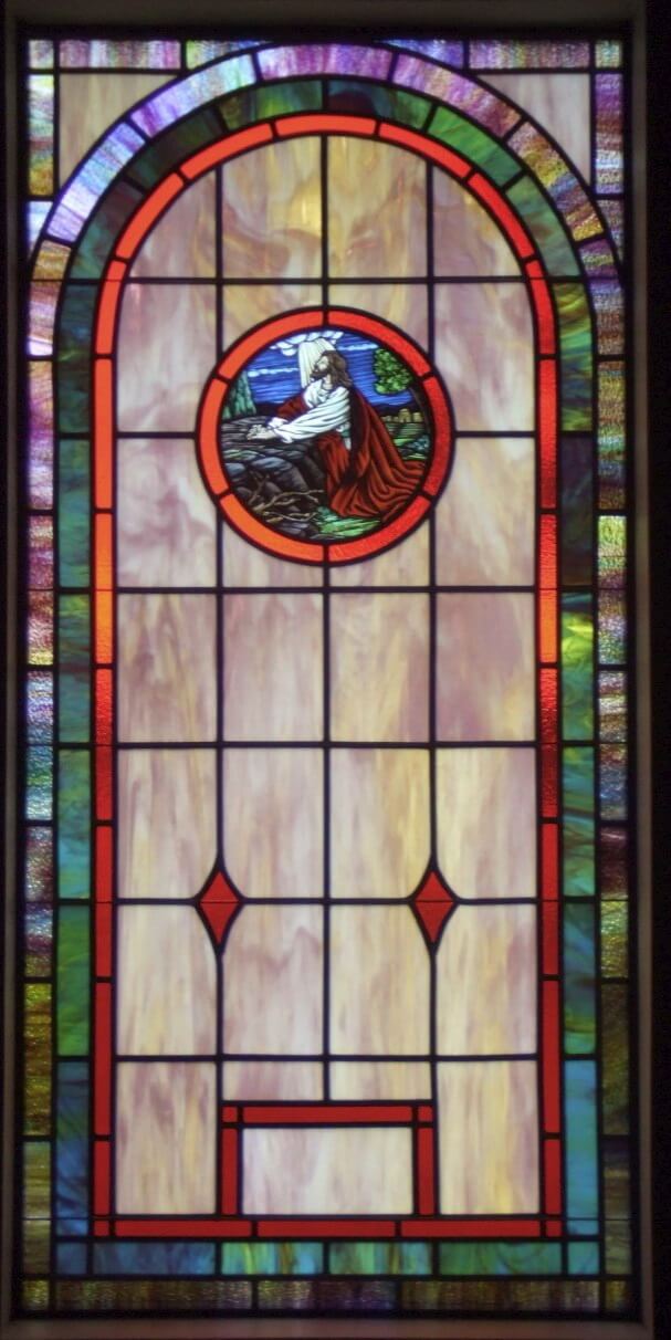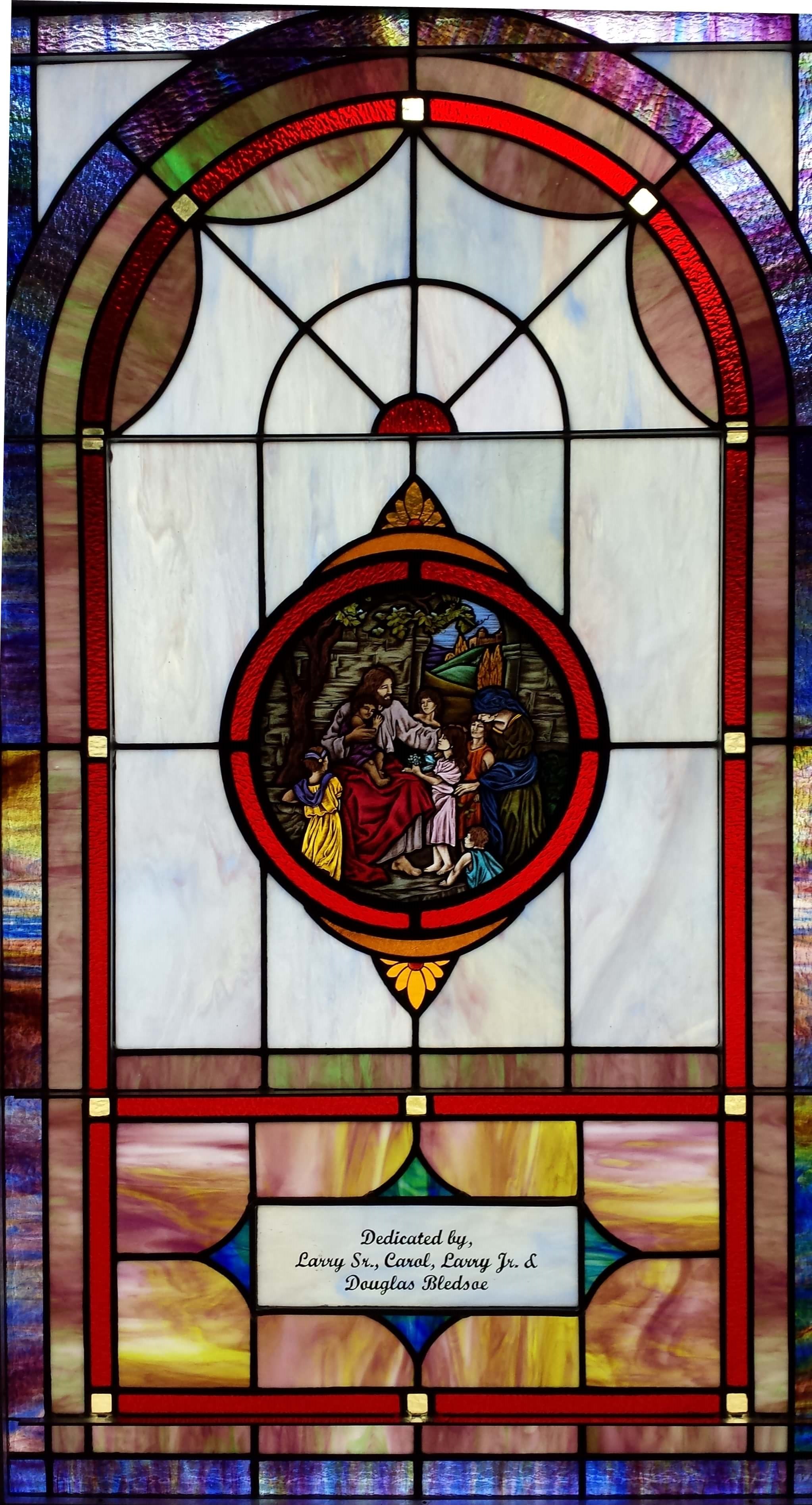 Below are examples of our most popular type of stained-glass window for churches due to their unique beauty as well as their affordability. This particular type of custom stained-glass window begins with a compilation of opalescent glass based on a specified color scheme. Then, a medallion is chosen to become the focal point of a story told under which a dedication or memorial plaque is placed in honor of a loved one.