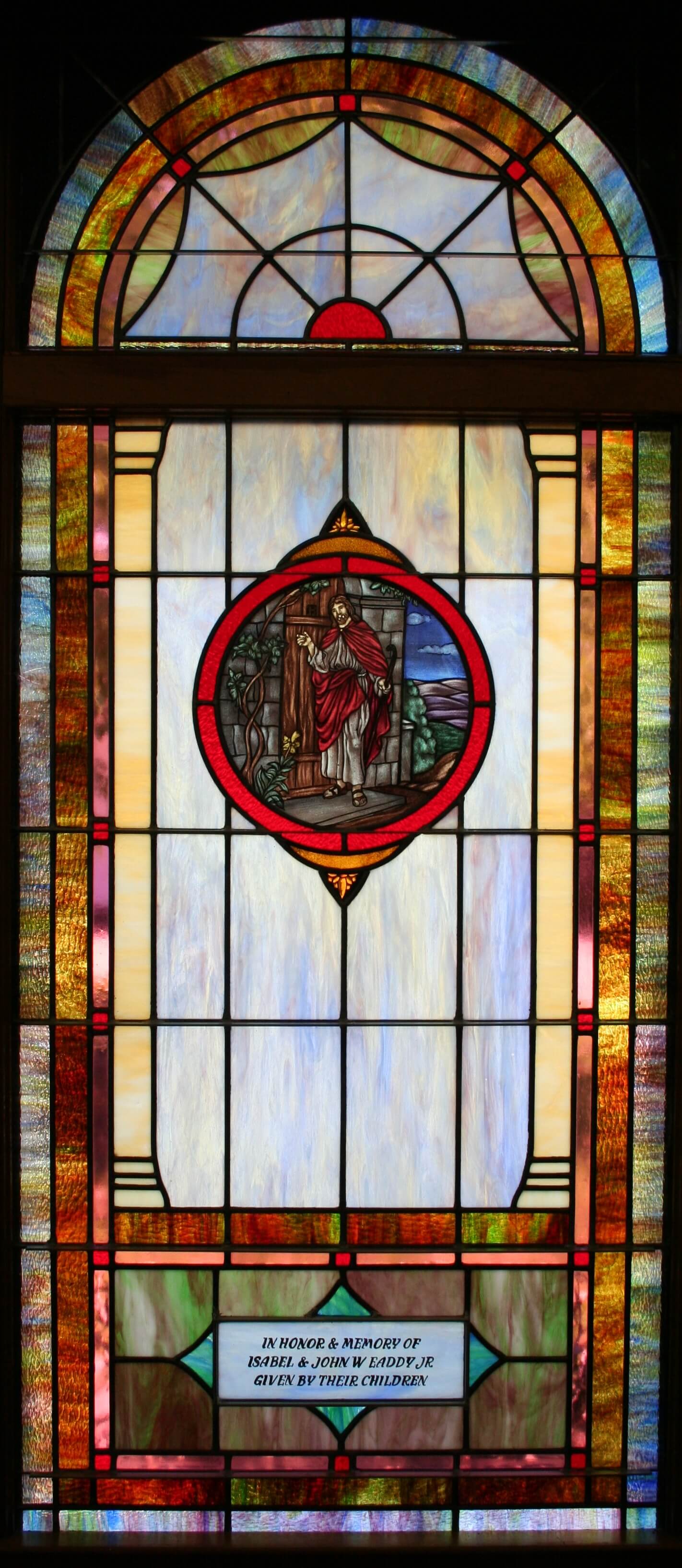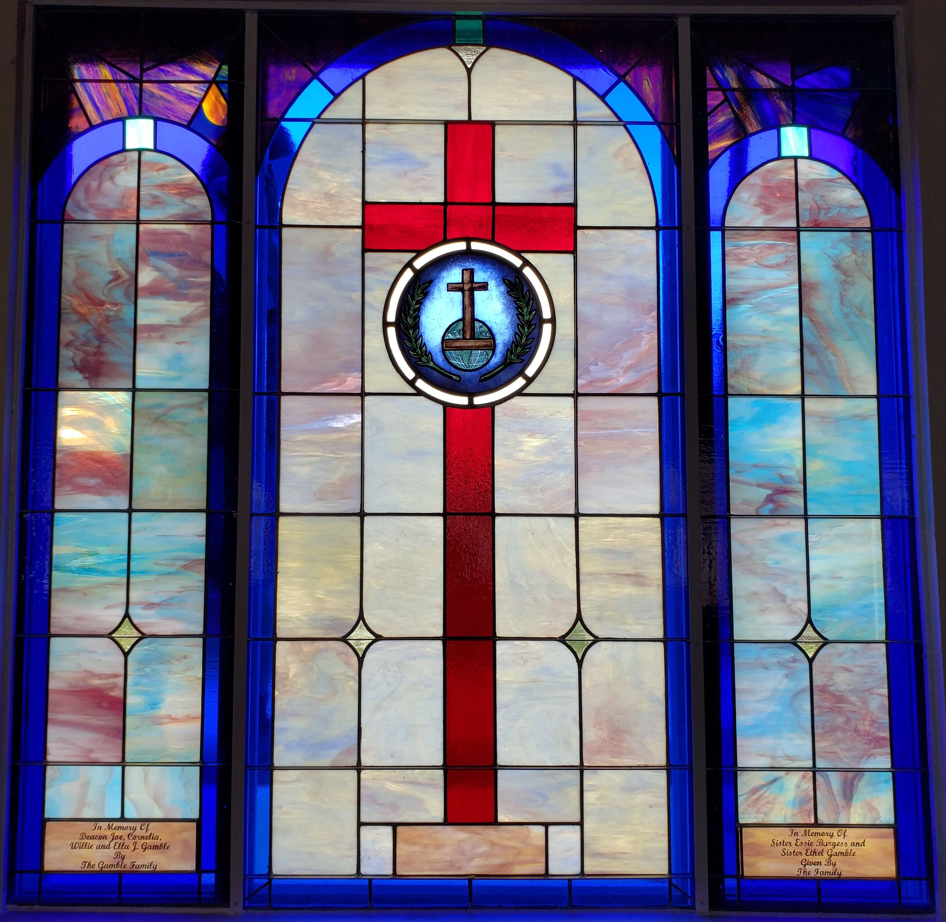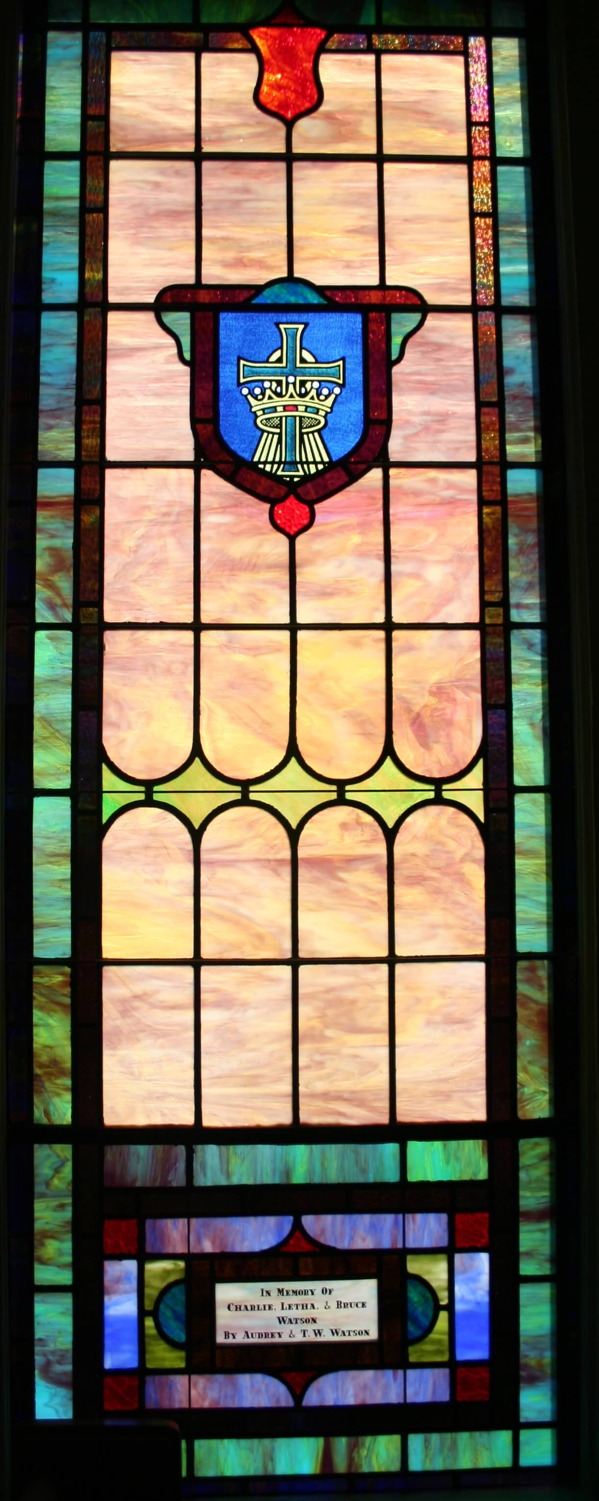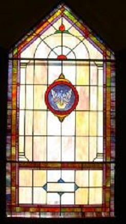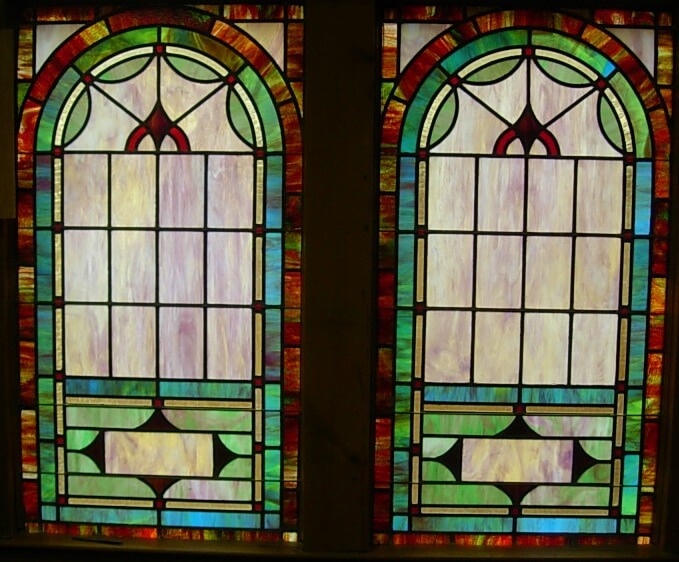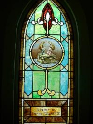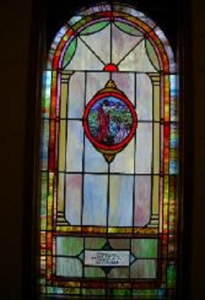 Below are examples of our most popular type of stained-glass window for churches due to their unique beauty as well as their affordability. This particular type of custom stained-glass window begins with a compilation of opalescent glass based on a specified color scheme. Then, a medallion is chosen to become the focal point of a story told under which a dedication or memorial plaque is placed in honor of a loved one.