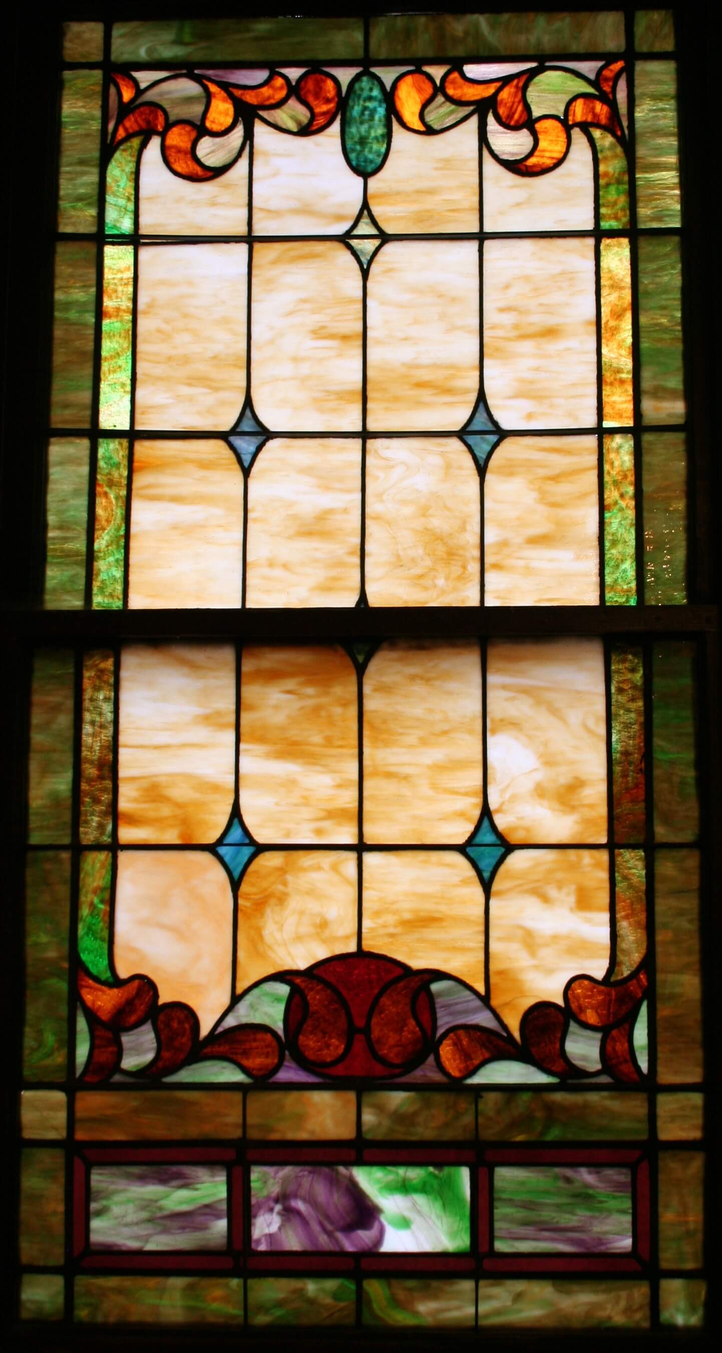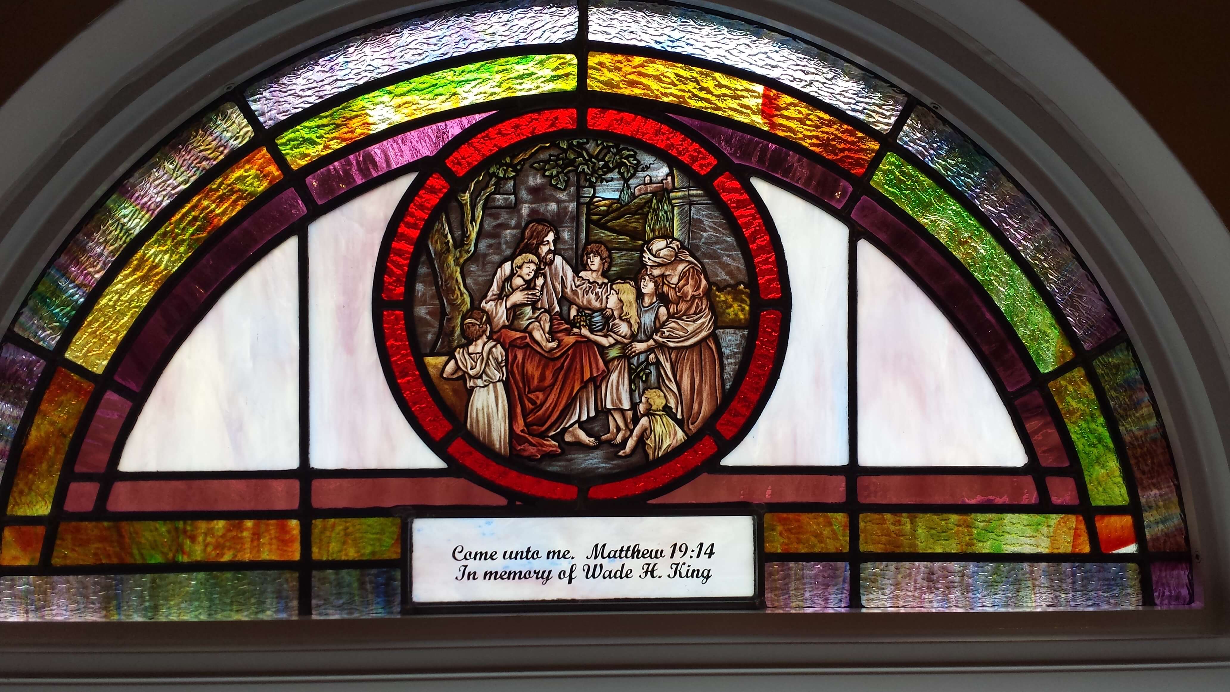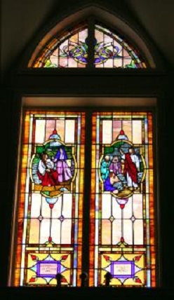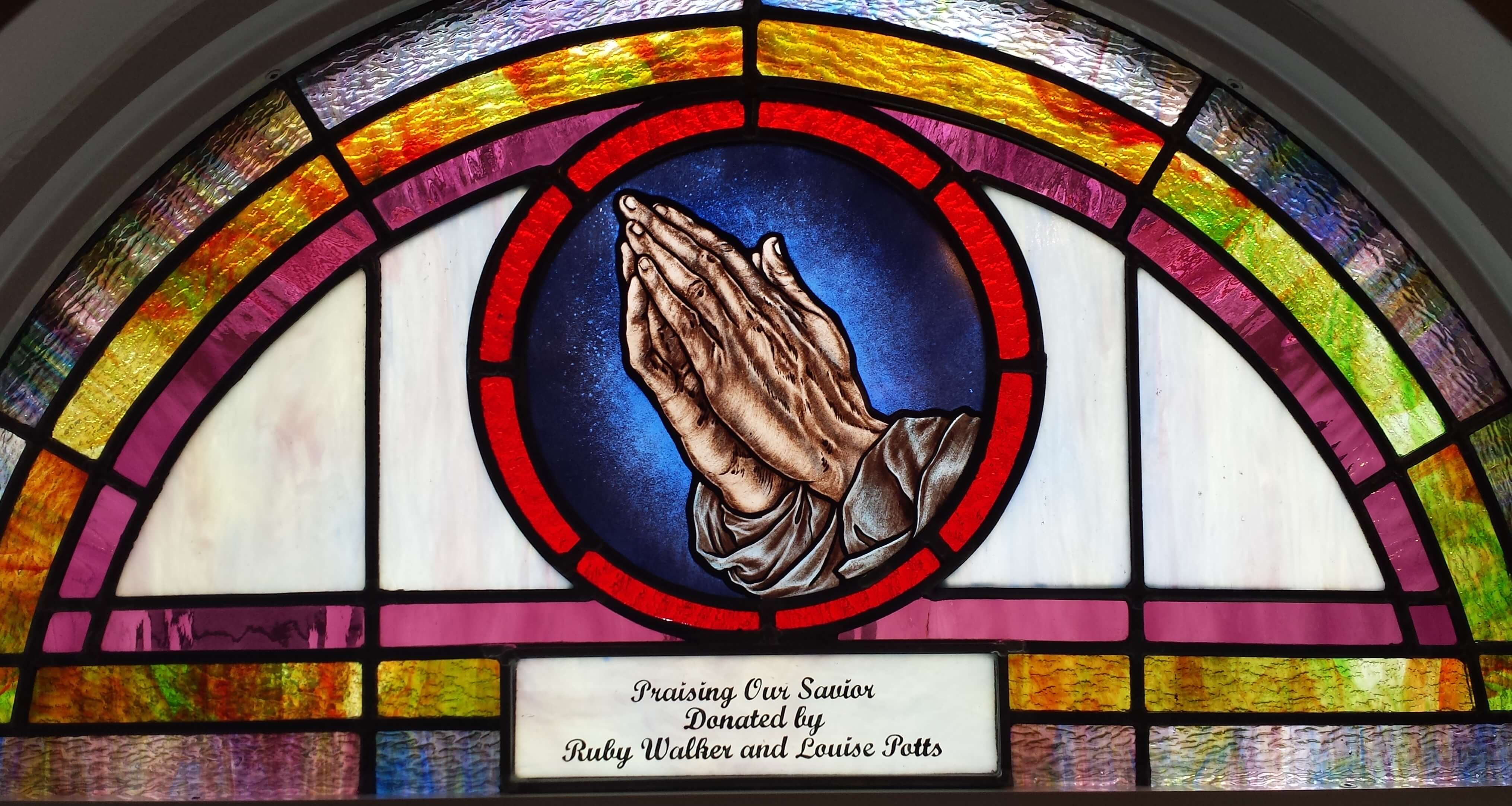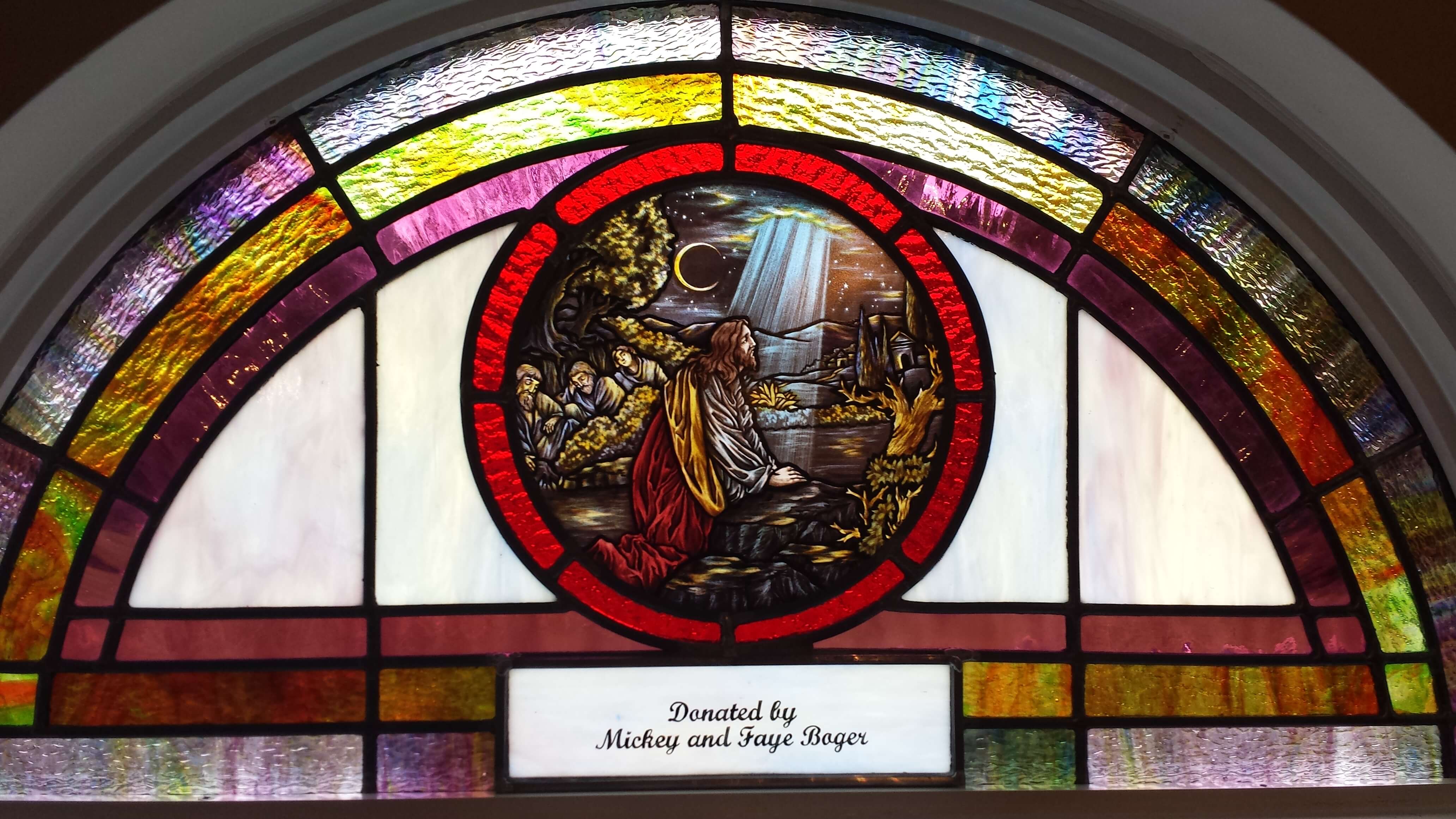 Below are examples of our most popular type of stained-glass window for churches due to their unique beauty as well as their affordability. This particular type of custom stained-glass window begins with a compilation of opalescent glass based on a specified color scheme. Then, a medallion is chosen to become the focal point of a story told under which a dedication or memorial plaque is placed in honor of a loved one.