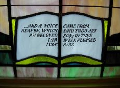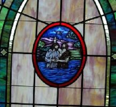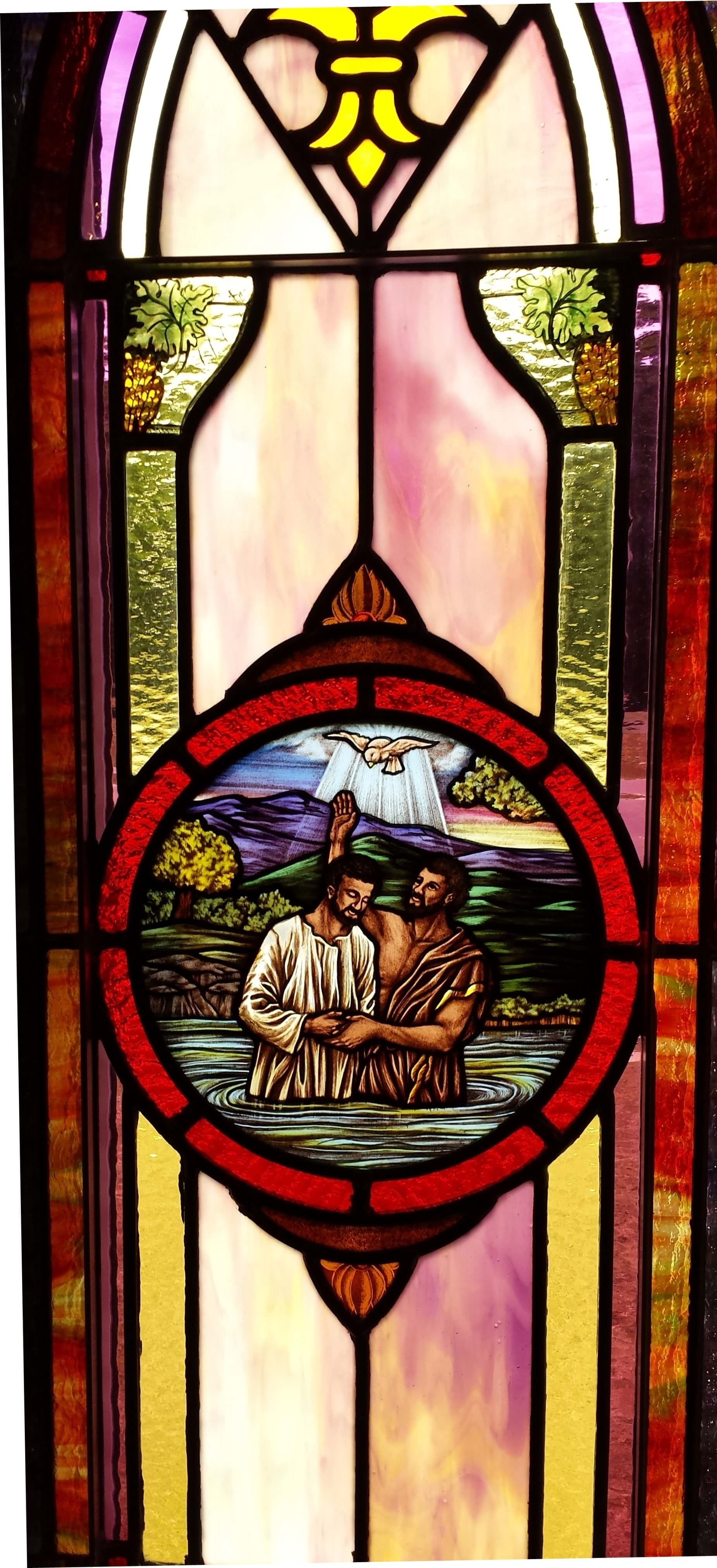 In this instance, a Bible verse is used in the dedication plaque area to compliment the beautiful and moving scene of the baptism of Jesus by John the Baptist.